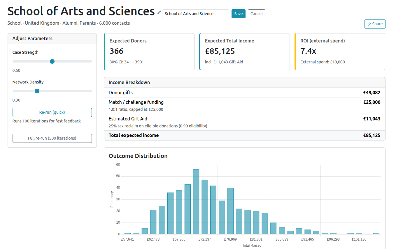 By running your future campaigns many times over, and benchmarking against similar campaigns in similar institutions, the Simulator can help institutions of any size to gain further clarity as to the direct impact an appeal can have. Whether that impact is around increasing donor participation, generating more income or creating a culture of philanthropy that supports a wide breadth of life-changing initiatives.